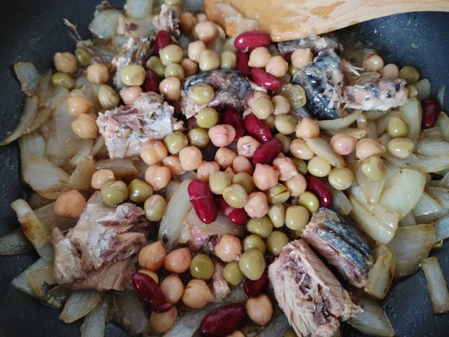 ③ 玉ねぎが色づいたらいったん火を止め、サバ缶を汁ごと加える。サバ缶は好みの大きさにほぐす。