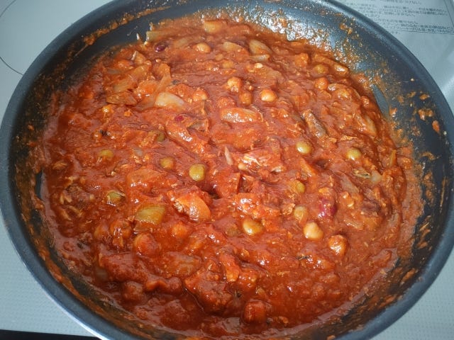 ④ ミックスビーンズ、あらごしトマトと水を加え火にかける。