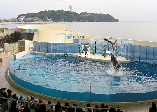 ショーが行われるイルカショースタジアムは、バックに江ノ島と湘南の海、という美しい景色が広がっているのも見所の一つなんです