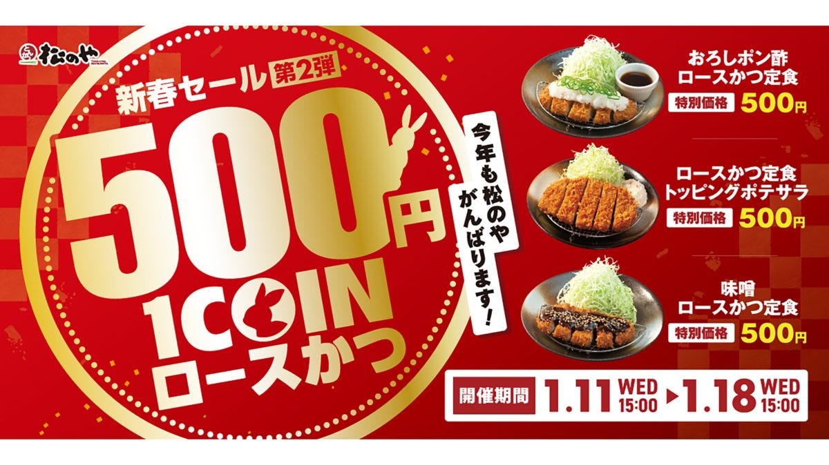 正月休みも終わり、仕事初めを迎えた人も多いだろう。そんなタイミングに、とんかつ専門店「松のや・松乃家」が11日から1週間限定で「ワンコインセール」を開催する。