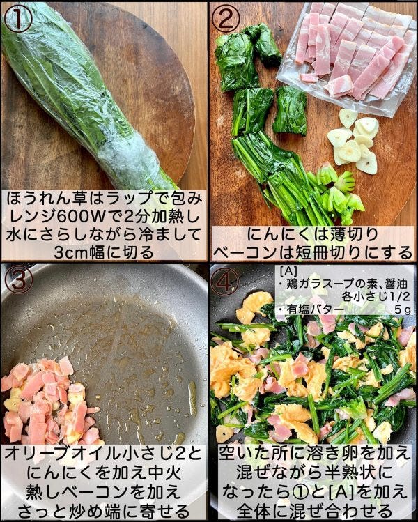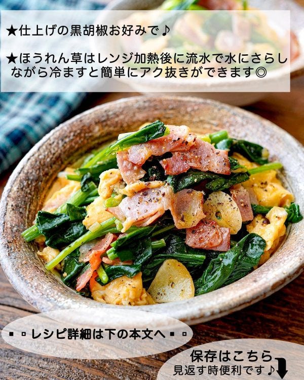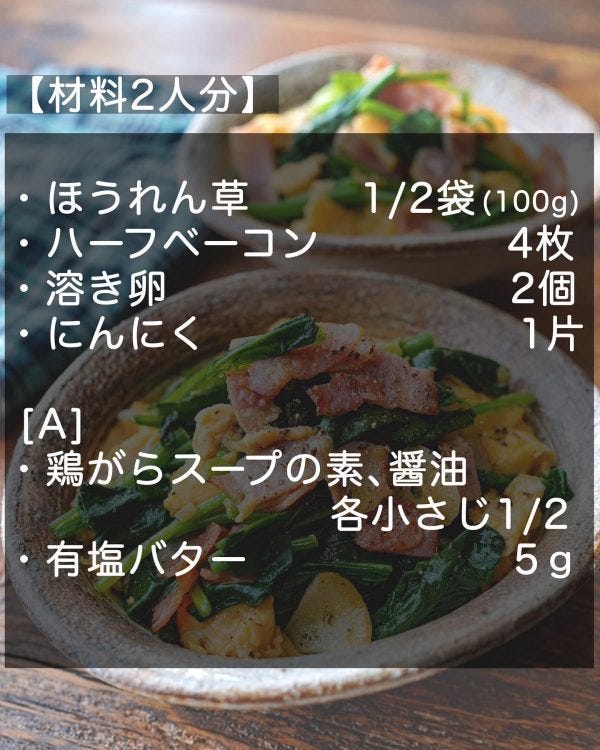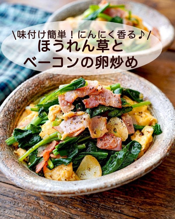 今回は「ほうれん草とベーコンの卵炒め」をご紹介します。