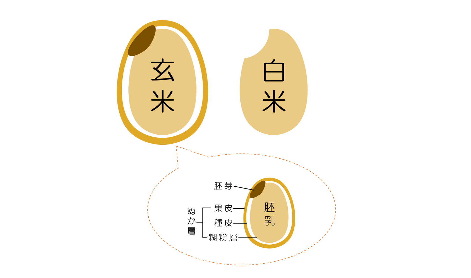 白米と玄米、栄養素の差を生むのは、除去されずに残っているぬかや胚芽の部分。白米には含まれない抗酸化作用成分や、抗ストレス作用で有名なGABAなどカラダにうれしい栄養素を多く含みます。