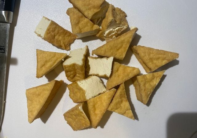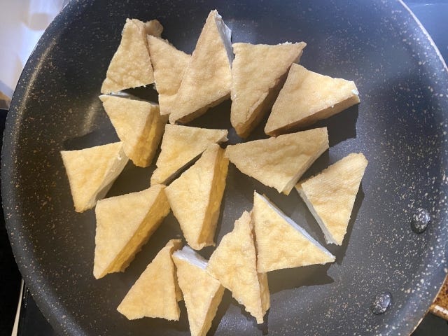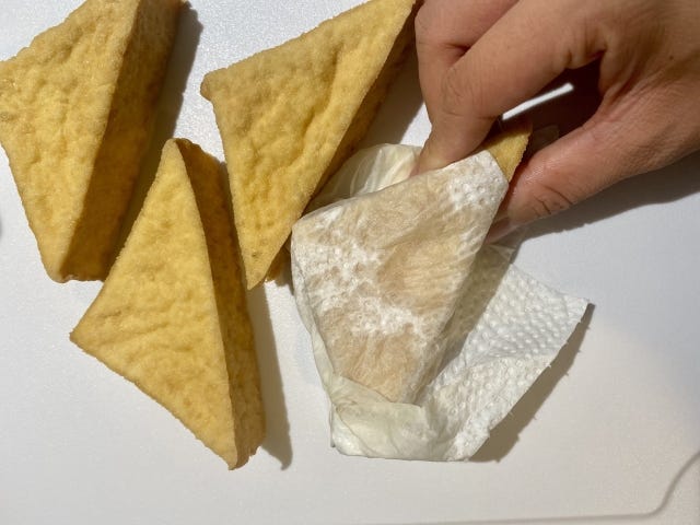 ・厚揚げにキッチンペーパーでを押し当てて油を抜き、4等分になるよう三角に切る。