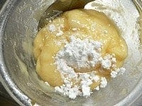 バターが全体になじんだら、片栗粉を加えて混ぜる。 片栗粉を加えて混ぜると、急に餅がまとまる。