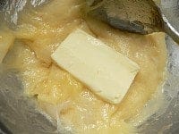 バターを入れ、バターを餅で包む感じで混ぜる。 この時点では、つるつるして分離したような感じになる。
