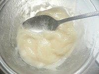 湯を捨てて、丈夫なスプーンでかき混ぜ、柔らかい餅にする。餅が固ければ追加加熱して柔らかくする。湯を捨てて混ぜる。