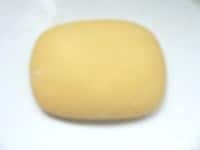 餅を電子レンジで柔らかくして、砂糖、塩、卵黄、バターを混ぜていくわけですが、バターを加えた辺りから、混ぜるのが難しいと感じるかと思います。でも、そんなに必死になって均一に混ぜる必要はありません。片栗粉を加えると、一気にまとまりますので、そこからは手でこねても大丈夫です。片栗粉を薄くつけた両手で軽くこねて、すべすべの餅にして成形します。なお、所要時間15分は、工程6までの時間です。