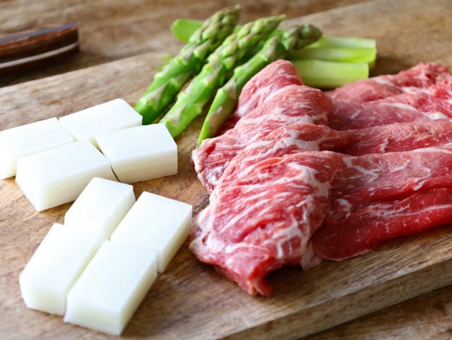 すき焼き用牛肉は、切らずにそのまま入れても、炒めているうちに切れて細かくなります。気になる場合は、半分に切ってから使用してください。