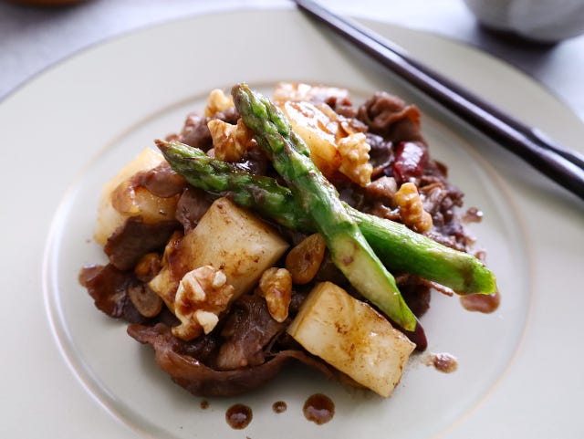 約20分切り餅と胡桃の牛肉甘辛炒めのレシピ