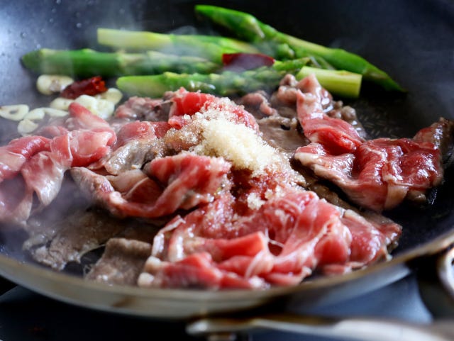 ③ すき焼き用牛肉と砂糖を入れて、さっと混ぜたら、酒、しょう油を入れ、火が通るまで炒める。