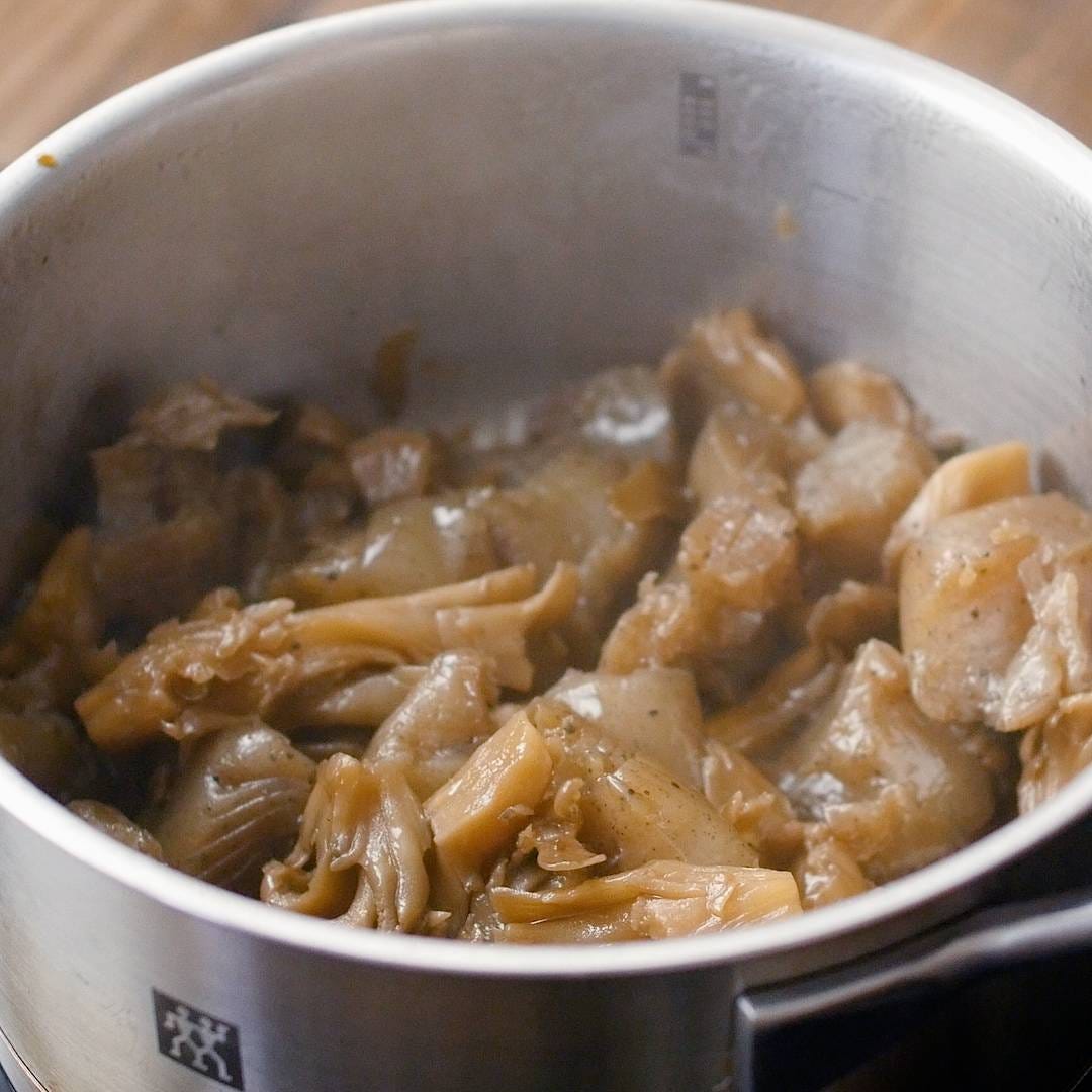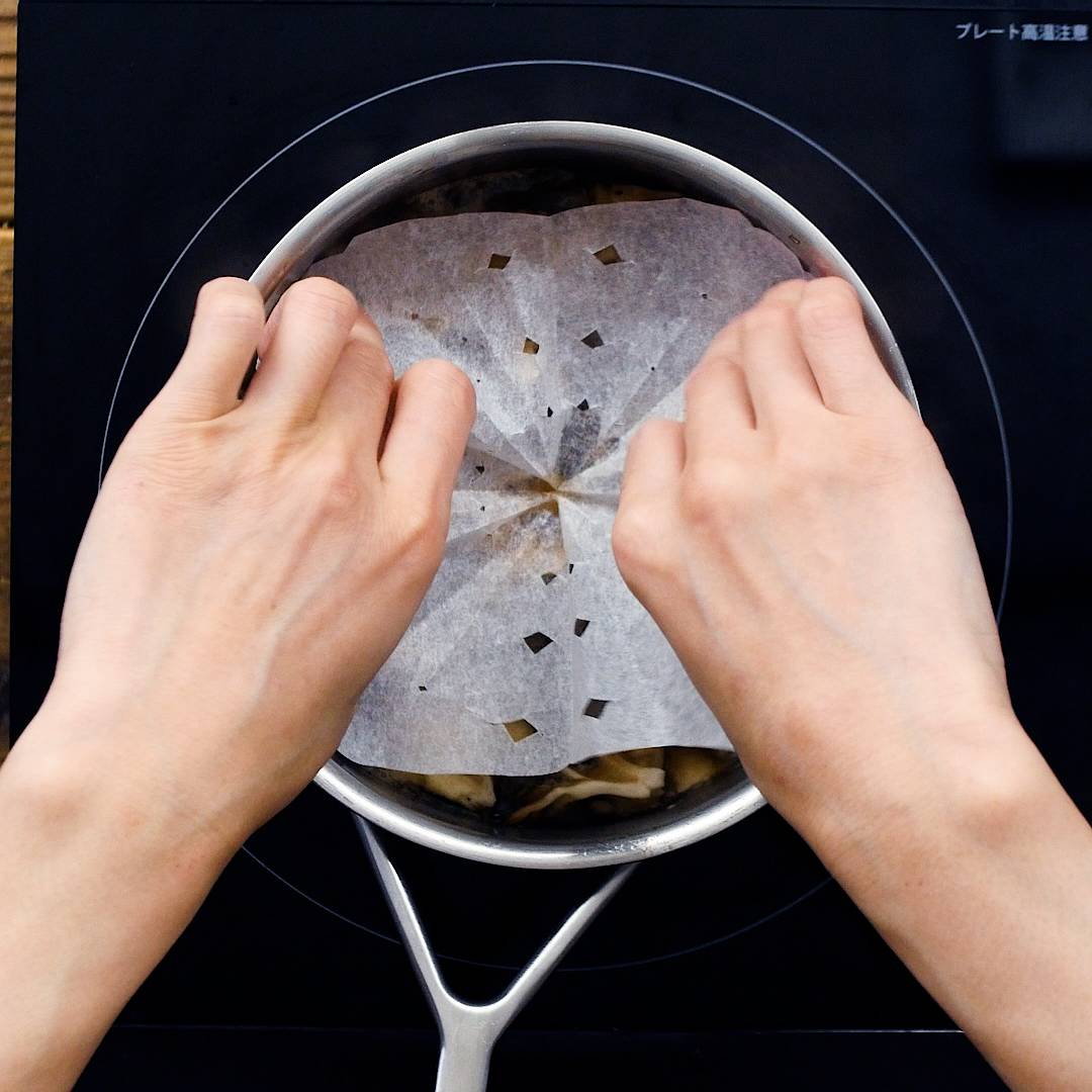 (a) を加えて落し蓋をし、弱中火で8分ほど煮ます。
