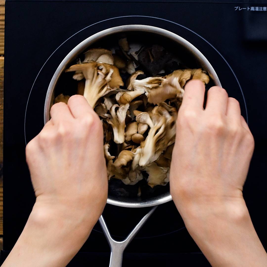 鍋に油を引かずに中火に熱し、こんにゃくを入れて1分ほどから炒りし、ごま油、まいたけをほぐしながらを加えて炒め合わせます。