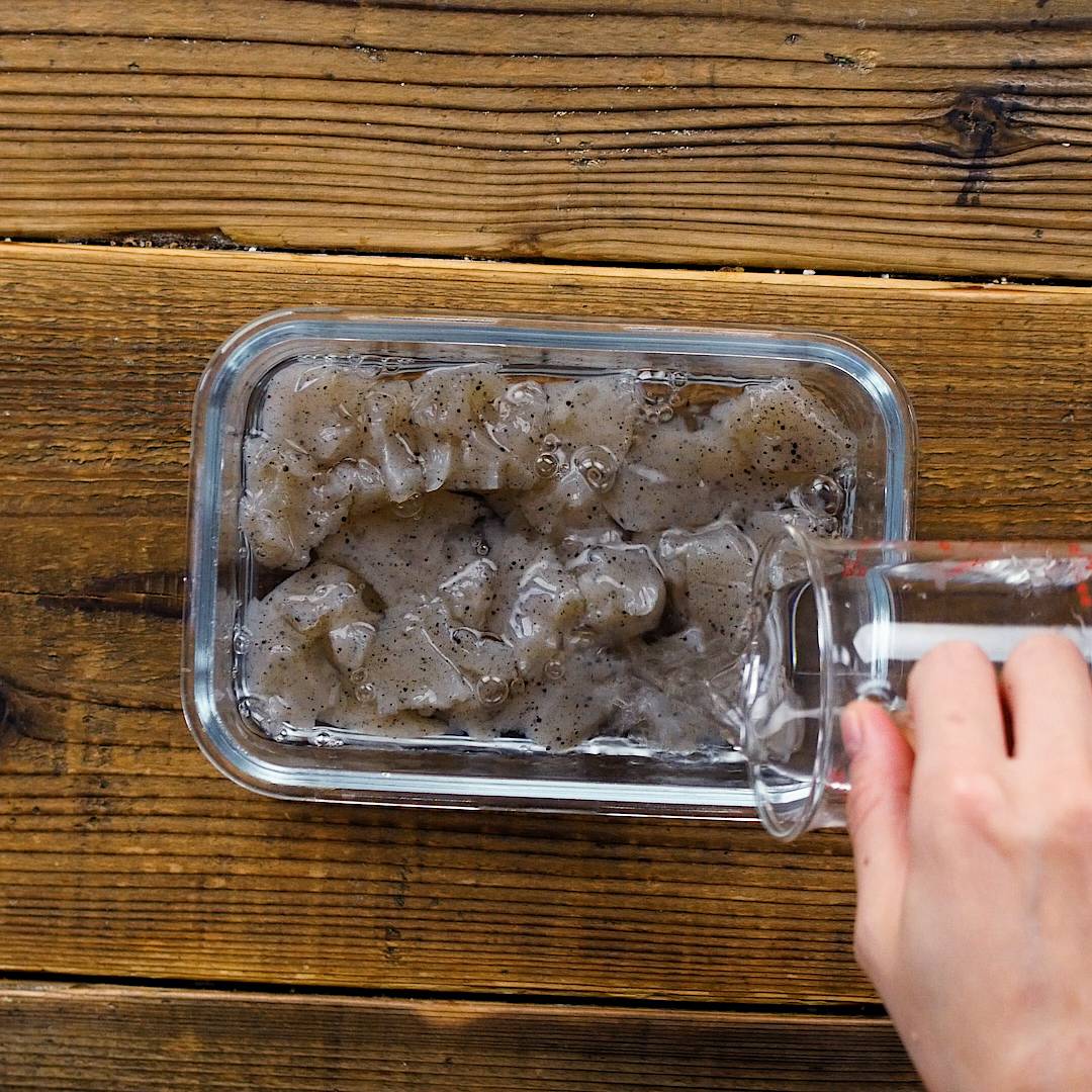 耐熱容器にうつし、かぶるくらいの水を入れてレンジ600Wで2分加熱して水気を切ります。