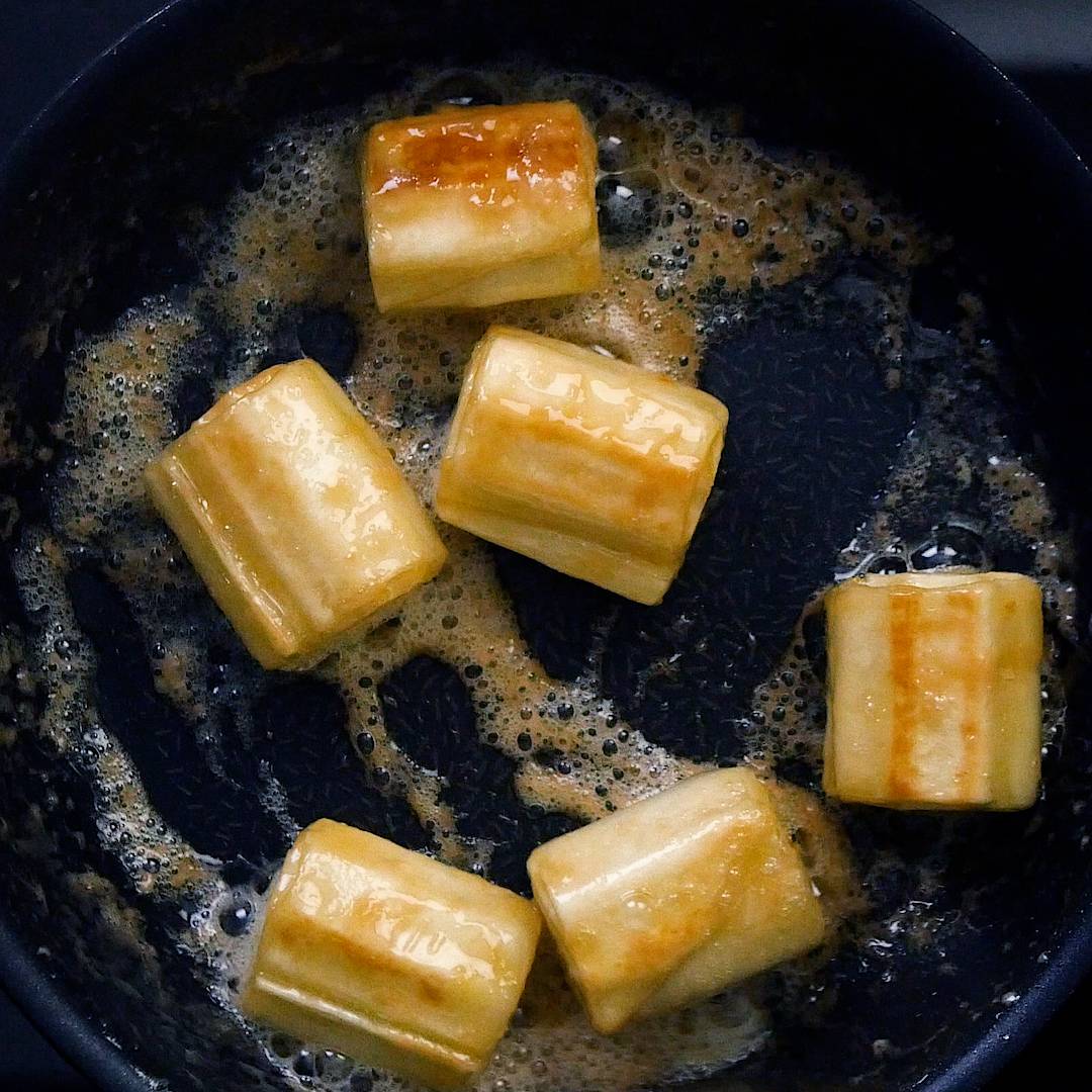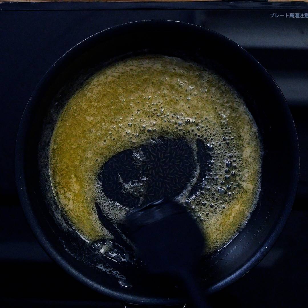 フライパンにバターを入れて溶かし、グラニュー糖、ラム酒、バニラオイル、ちくわぶを加えます。