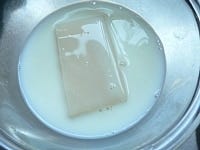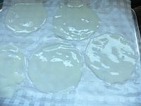工程3で、とろとろの餅はできるだけ薄く伸ばします。丸く伸ばした餅を一旦冷凍庫で固めるのは、作業しやすくするためです。固まるまでにそんなに時間はかかりません。形はあまり気にせずに、手早く、手際良くやりましょう。