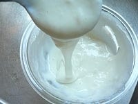 スプーンでグルグル混ぜ、餅がとろとろになったら、グラニュー糖を入れて混ぜる。