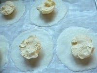 金属バットの上にオーブンペーパーを敷く。餅をスプーンですくって、オーブンペーパーの上に丸く薄く伸ばす。あら熱が取れたら冷凍庫で固める。バットごと冷凍庫に入れる。