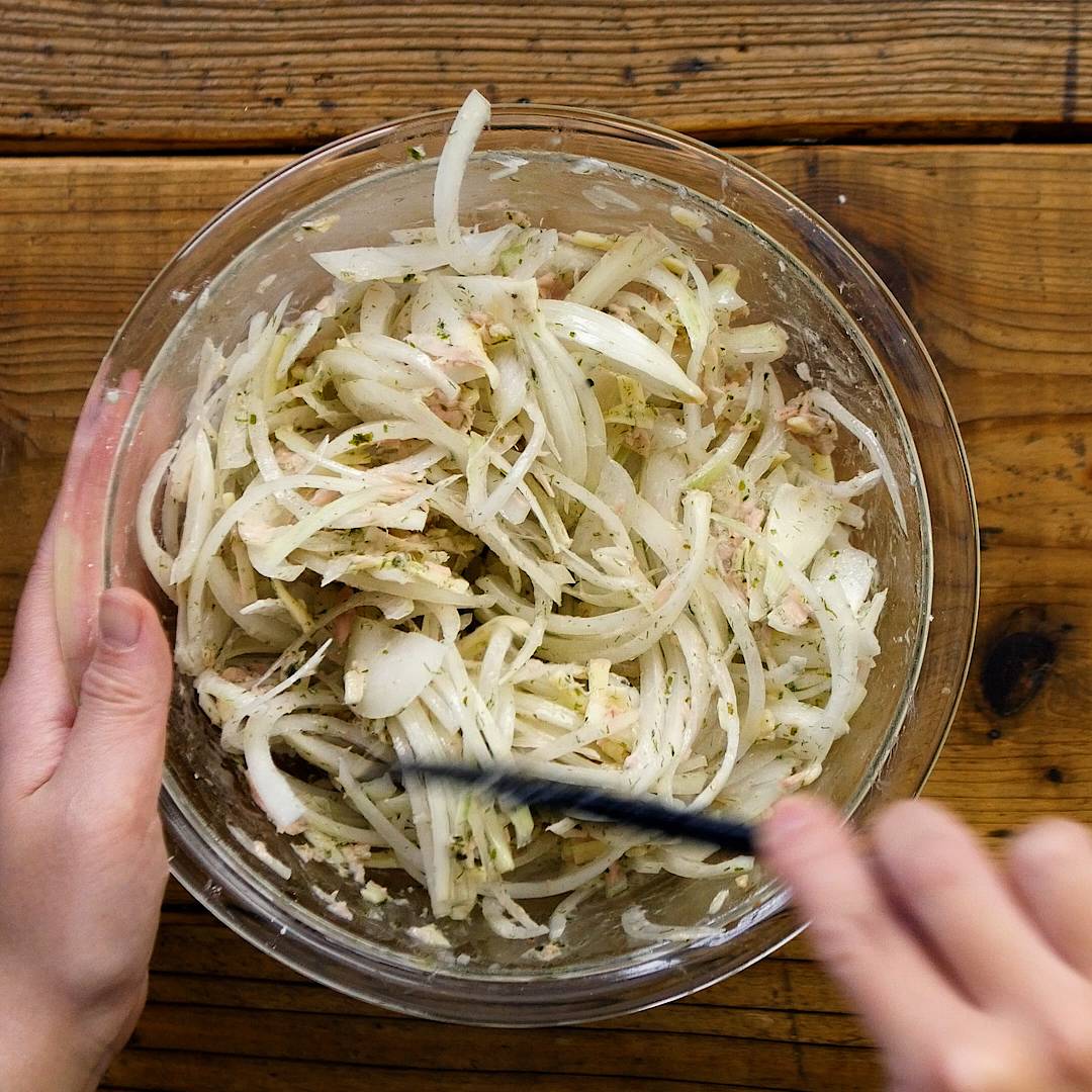 ボウルに玉ねぎ、ツナ缶、片栗粉、青のり、とろけるチーズ、水を入れて混ぜ合わせます。