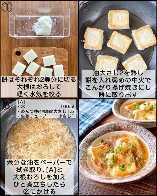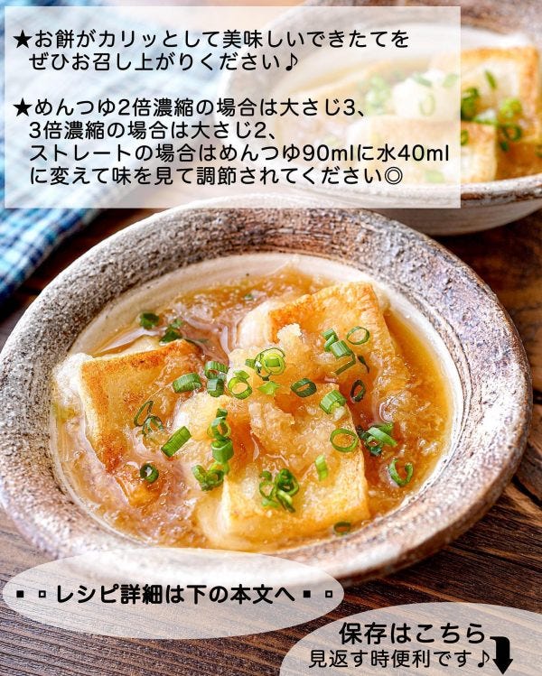 こんがり揚げ焼きにしたお餅がじゅわっとつゆと合わさり、大根おろしと絡んでとっても美味しいおもちレシピです。