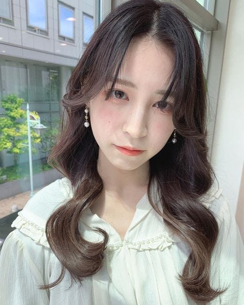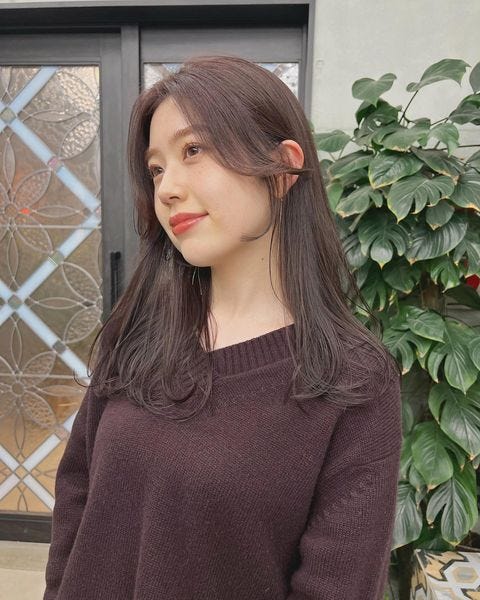 韓国ヘアのヨシンモリ風のロングにグロスブラウンのヘアカラーを組み合わせると、まろやかでフェミニンな上品ヘアになります。