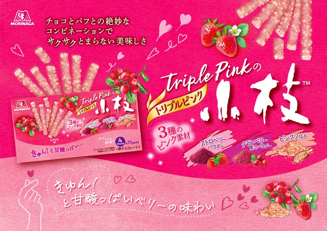 「トリプルピンクの小枝」は、3種のピンク素材のストロベリーパウダー、クランベリーパウダー、ピンクソルトを使用し、きゅんっと甘酸っぱいベリーの味わいが特徴のチョコレート。チョコとパフの絶妙なコンビネーションでサクサクっとした食感が止まらない美味しさで、可愛らしいピンクのパッケージと、ピンク色の小枝は今だけの特別な商品。