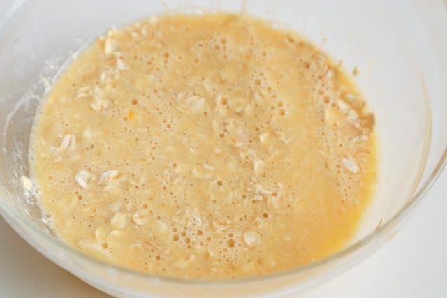 ② ボウルに卵を割りほぐし、甘酒、オートミール、つぶしたバナナを加えて混ぜ合わせる。