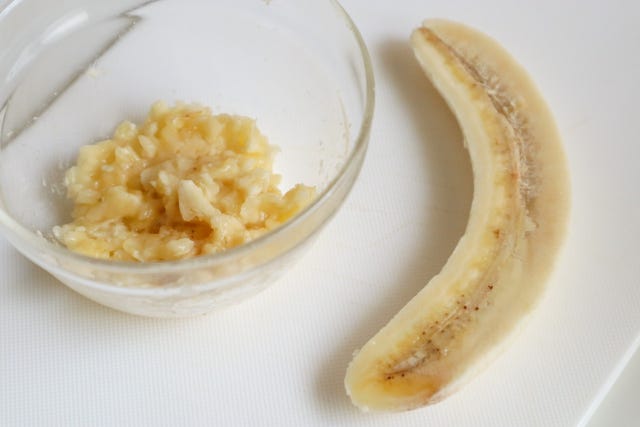 ① バナナは縦半分に切り、ひとつはフォークなどでつぶす。もうひとつはトッピング用にとっておく。