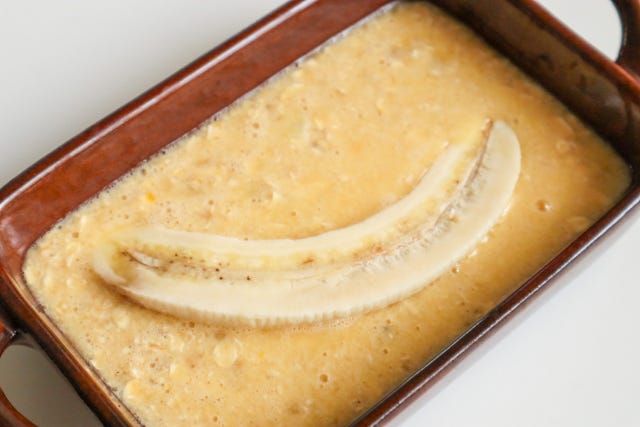 ③ 型に生地を流し、真ん中にトッピング用のバナナをのせる。