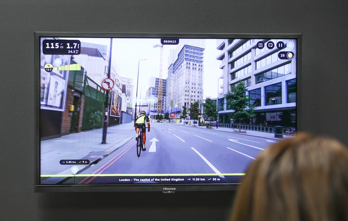 久々にバイクにまたがります。アプリでコースを選び、スタート。バイクを漕ぐとアバターも動き始めました。