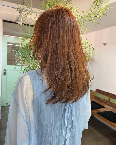 こちらはオレンジとコーラルピンクをブレンドしたヘアカラーを、ロングレイヤーに組み合わせた柔らかなスタイルです。