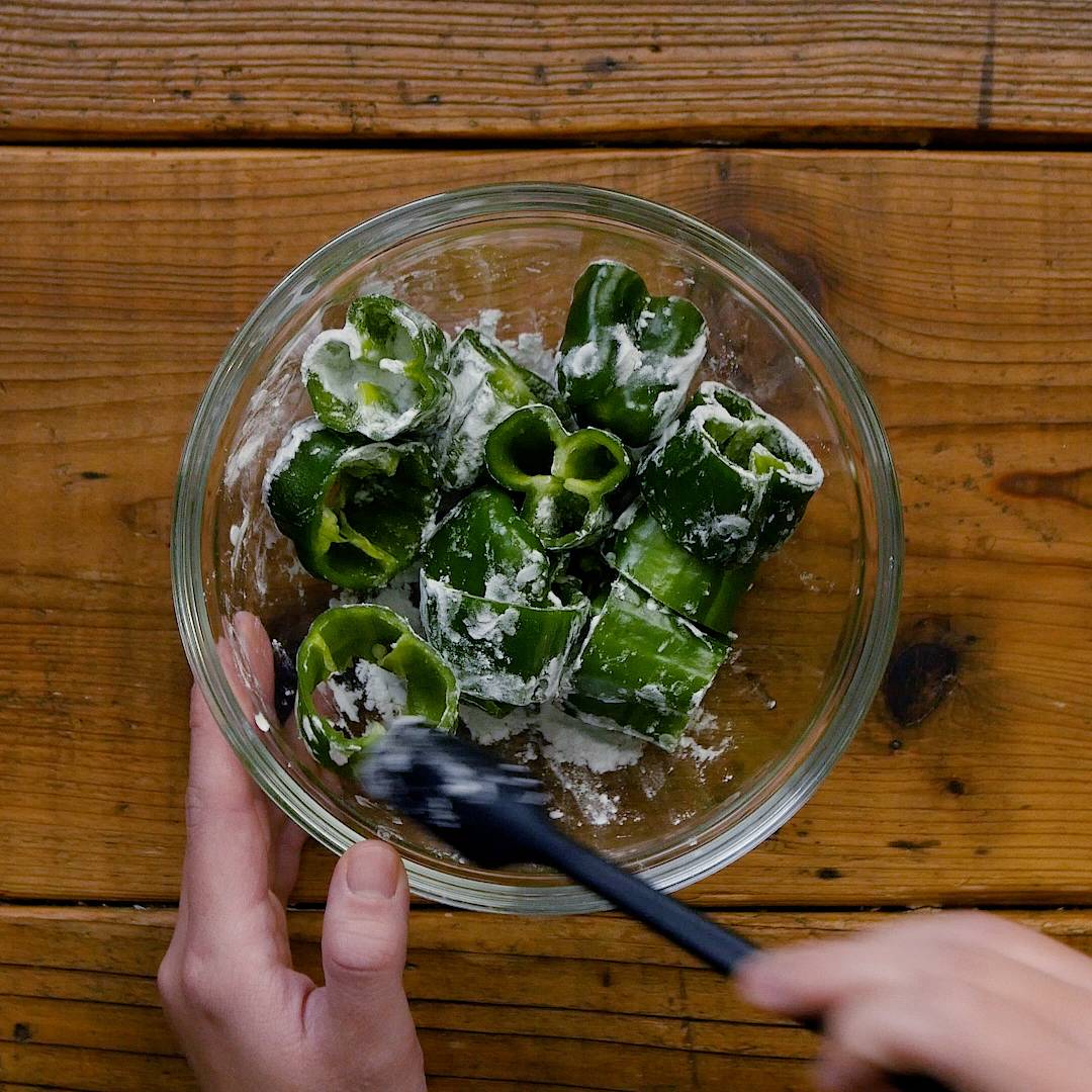 ボウルにピーマンを入れ、片栗粉を加えて混ぜ合わせます。
