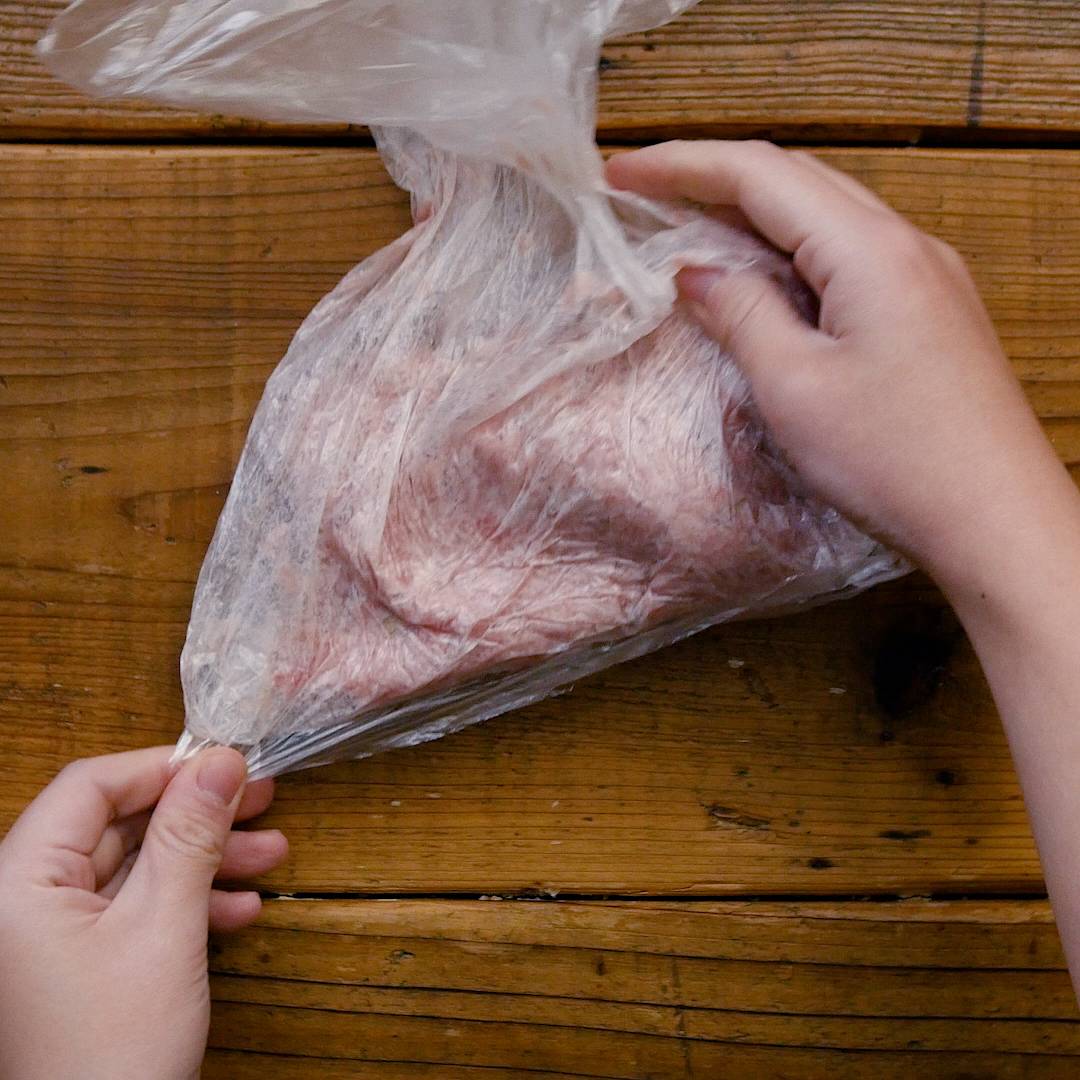 ビニール袋に豚ひき肉、玉ねぎ、(a) を入れ、よく揉んで混ぜ合わせます。