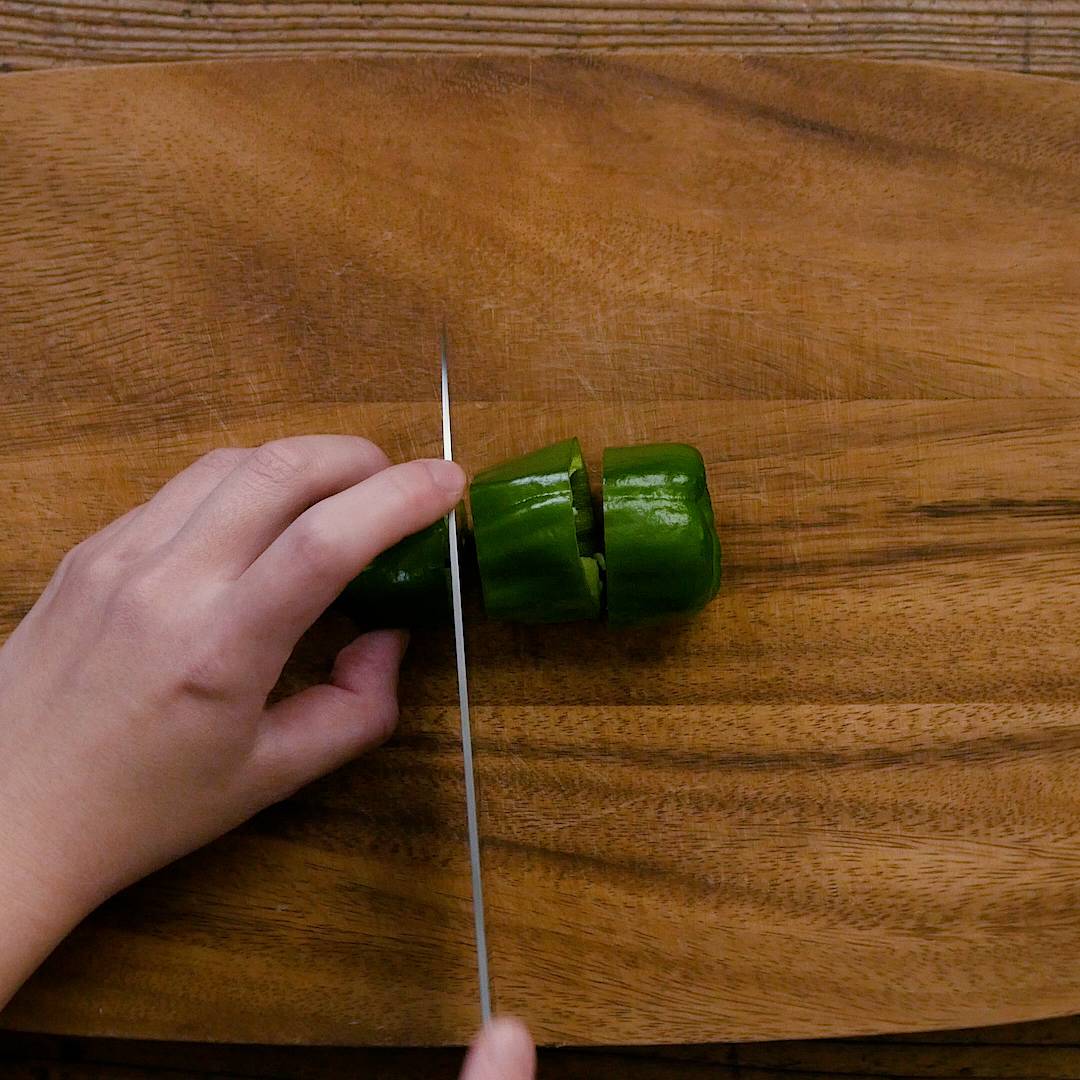 ピーマンはヘタと種を除いて1.5cm幅の輪切りにします。