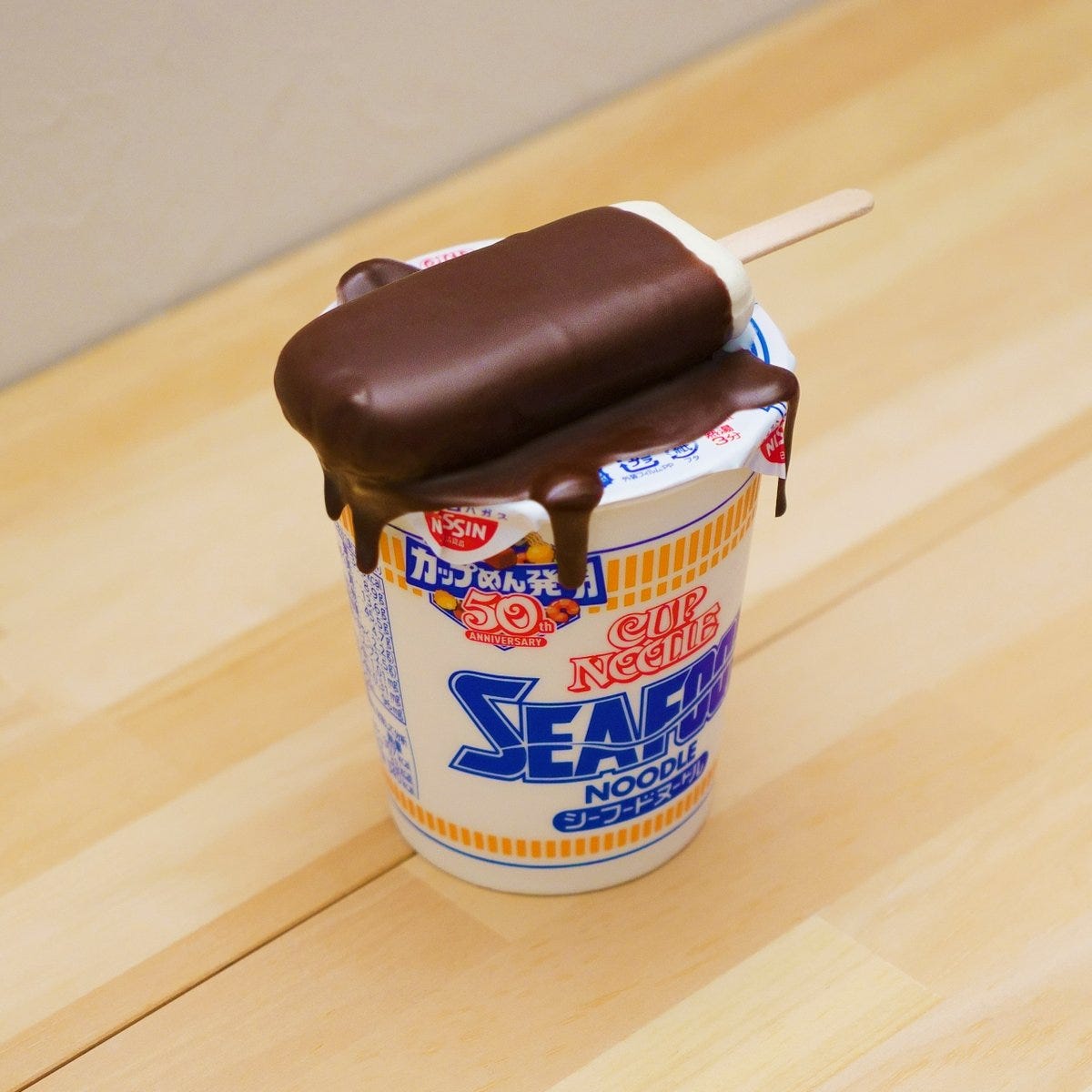 過去には、チョコレートアイスのフタ止めアイデアも投稿されていました。こちらも43万いいねを獲得するほどの人気ぶり。2022年9月には、カップヌードル16種とセットで数量限定販売が実現されましたよ!詳しい記事はこちら▼Twitterで43万いいね「カップヌードルのフタにアイスを置いたの誰!?」事件