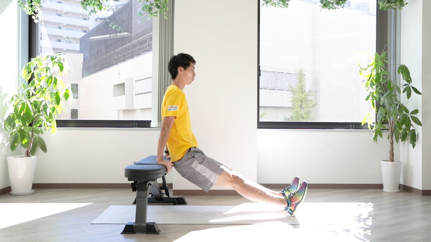 ベンチに座り、両手をお尻の横につく お尻を浮かせ、足を遠くに伸ばして体を下ろしていく 限界まで下ろしたら元の姿勢に戻る