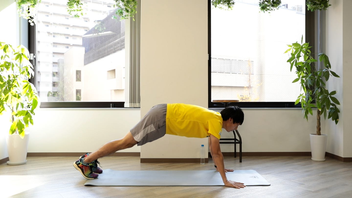 王道筋トレ「腕立て伏せ」の手幅を広げたやり方です。初心者はヒザをついて行っても構いません。大胸筋も鍛えることができます。
