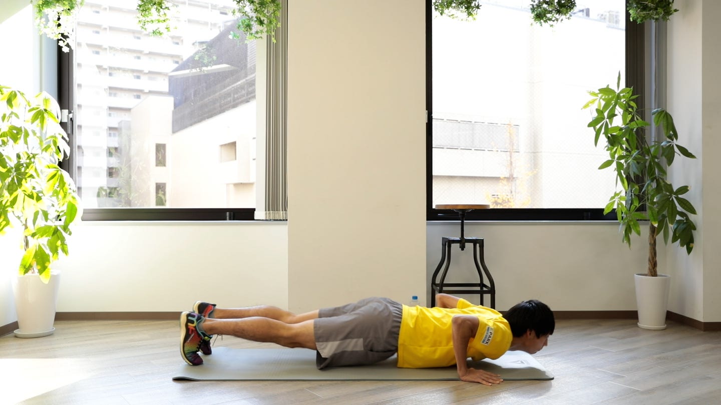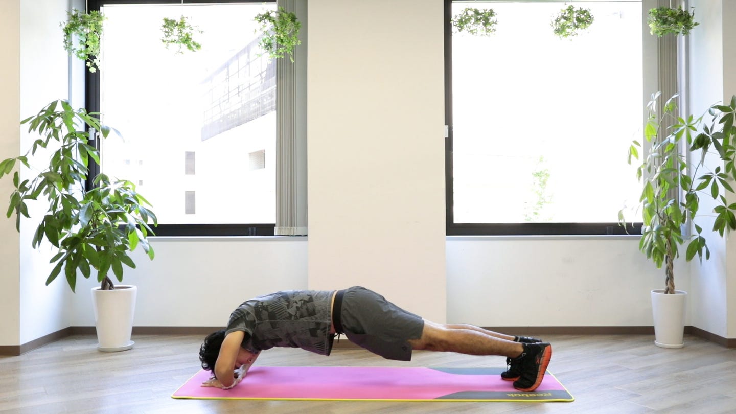 腕を床に置き、上半身をあげて足を伸ばす(つま先立ちで体をキープ) 片肘ずつ床につけ、片肘ずつ起こしていく 左右交互に繰り返す