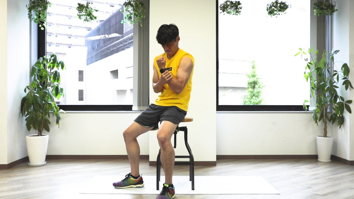 右手でこぶしを握る 握っている手は、下へ押すように力を加える 互いに抵抗を加えながら、内側・外側へ上げ下げする