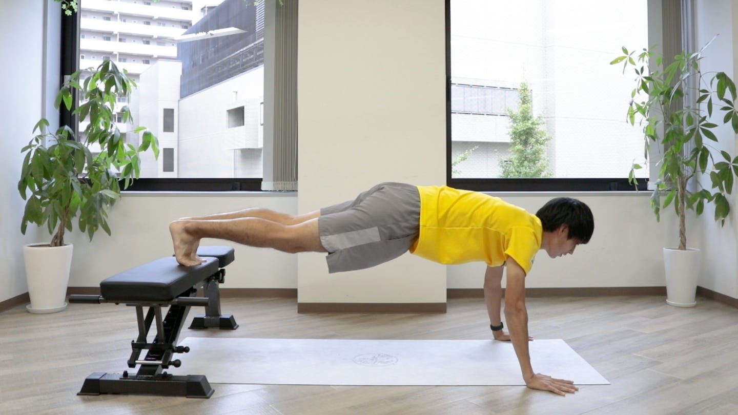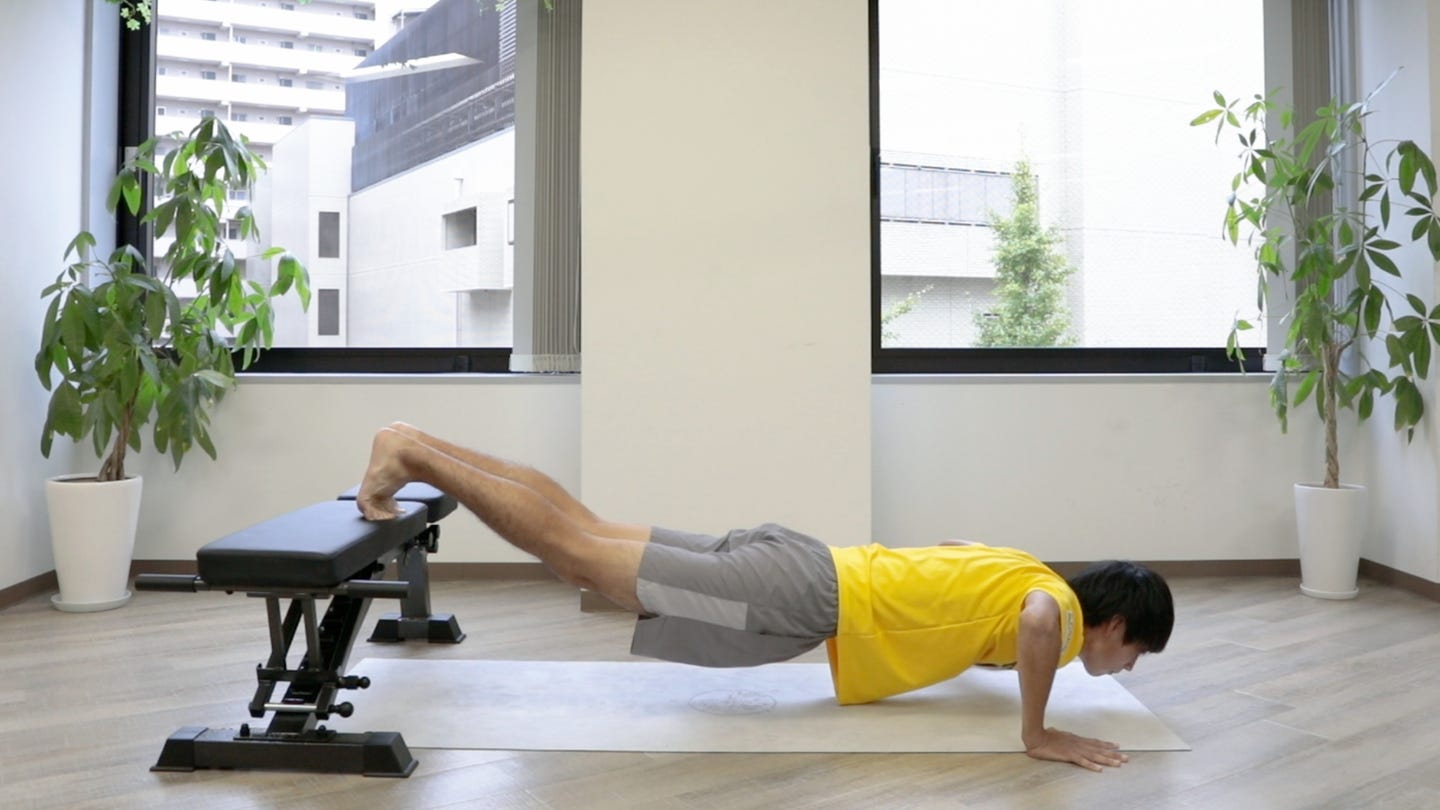 ぐらつかないイスなどを用いて、足の高さを上げて行う腕立て伏せです。足の高さが上がればそのぶん負荷が高まるので、初心者は低めから行いましょう。大胸筋も鍛えることができます。