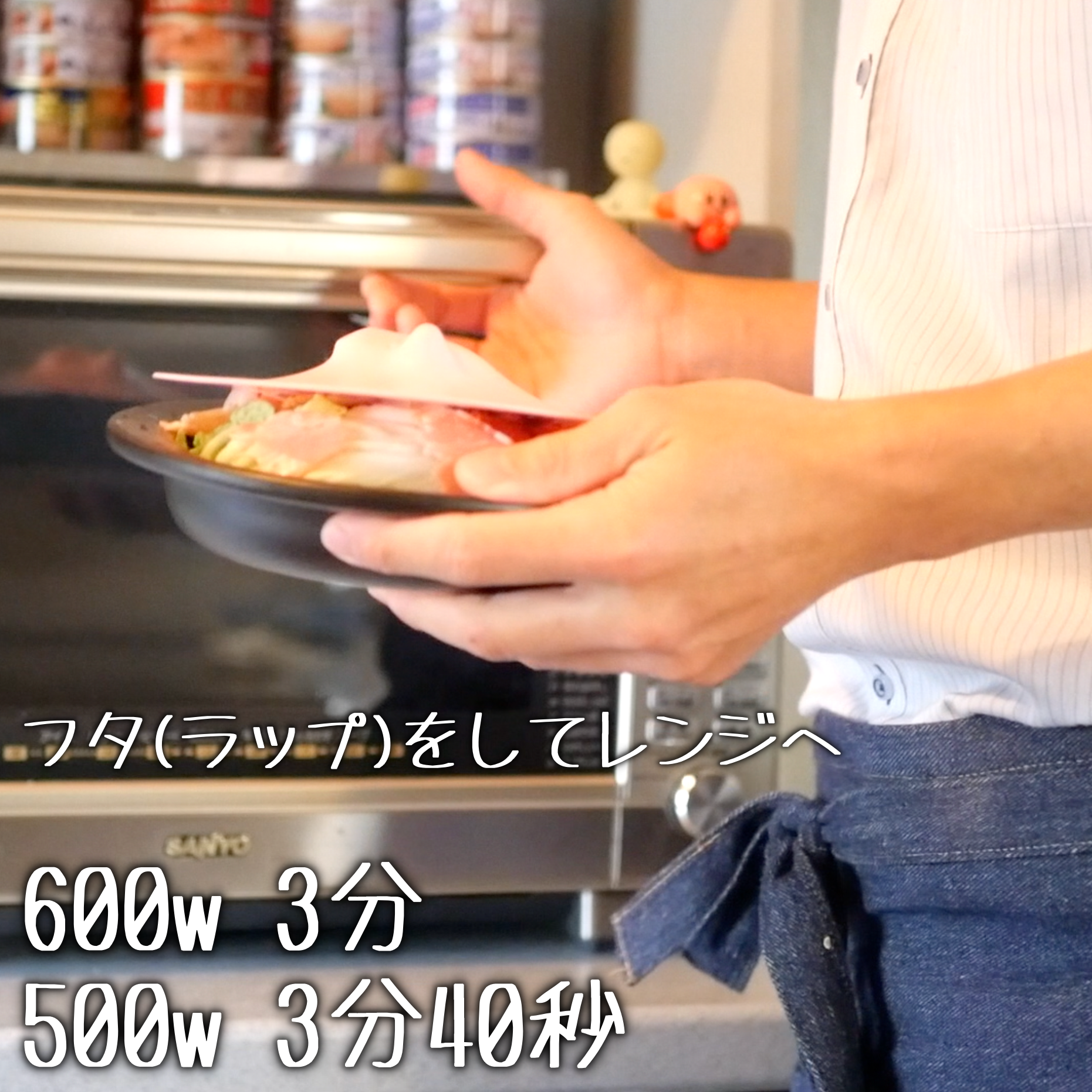 フタをして(またはラップをかけて)電子レンジ600Wで3分(500Wの場合、3分40秒)加熱します。 白菜は加熱後に縮むので、フタが完全に閉まらなくてもOKです。