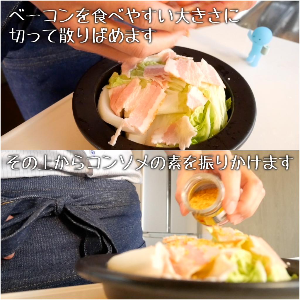 ベーコンも食べやすい大きさにちぎり、白菜の上に散りばめます。 手が汚れるのが嫌な方は、もちろん包丁を使ってもOKです。 ベーコンの上からコンソメを振りかけます。