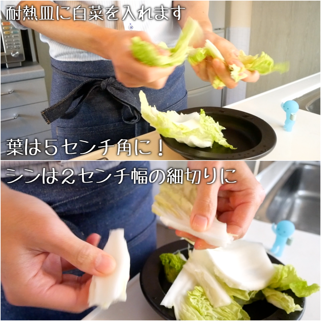 白菜は葉と芯の部分に分け、葉は5センチ角程度に、芯は食べやすい大きさで2センチ幅の細切りになるよう手でちぎります。 包丁を使うのが面倒なのと、手でちぎると断面が大きく味が染み込みやすくなります。 切った白菜は耐熱皿にギュギュッと詰め込みます。
