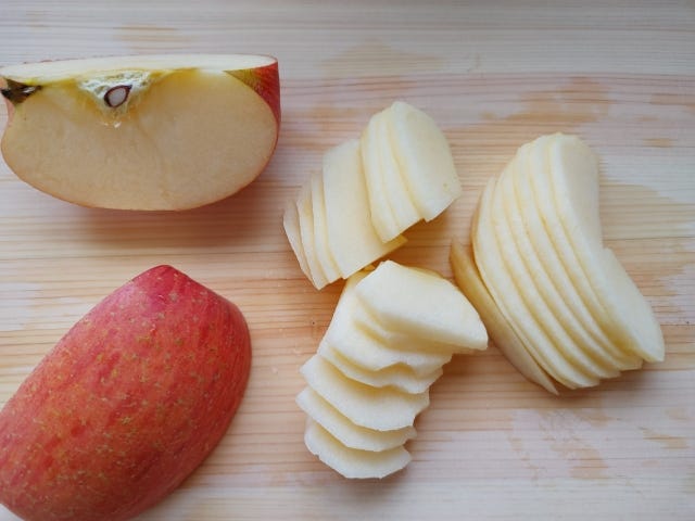 ④ りんごを4等分にし、芯を取り除き皮をむく。薄切りにし、半分にカットする。