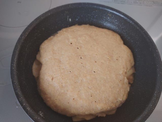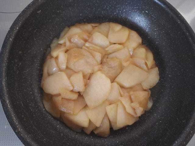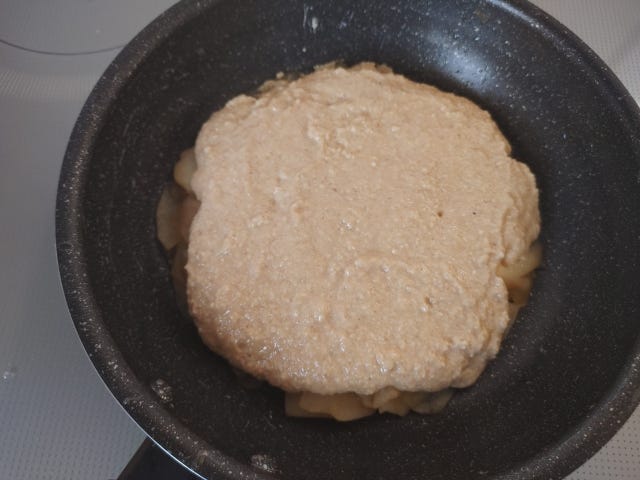 ⑦ りんごが色づいたら、オートミールの生地を流し入れる。