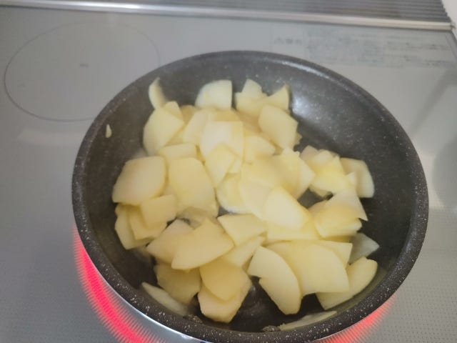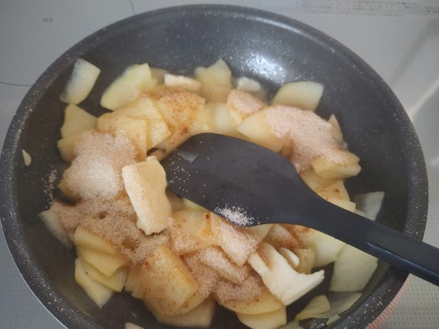 ※フライパンの端っこは焼き色がつきにくいので、りんごをフライパンの真ん中に集めてください。