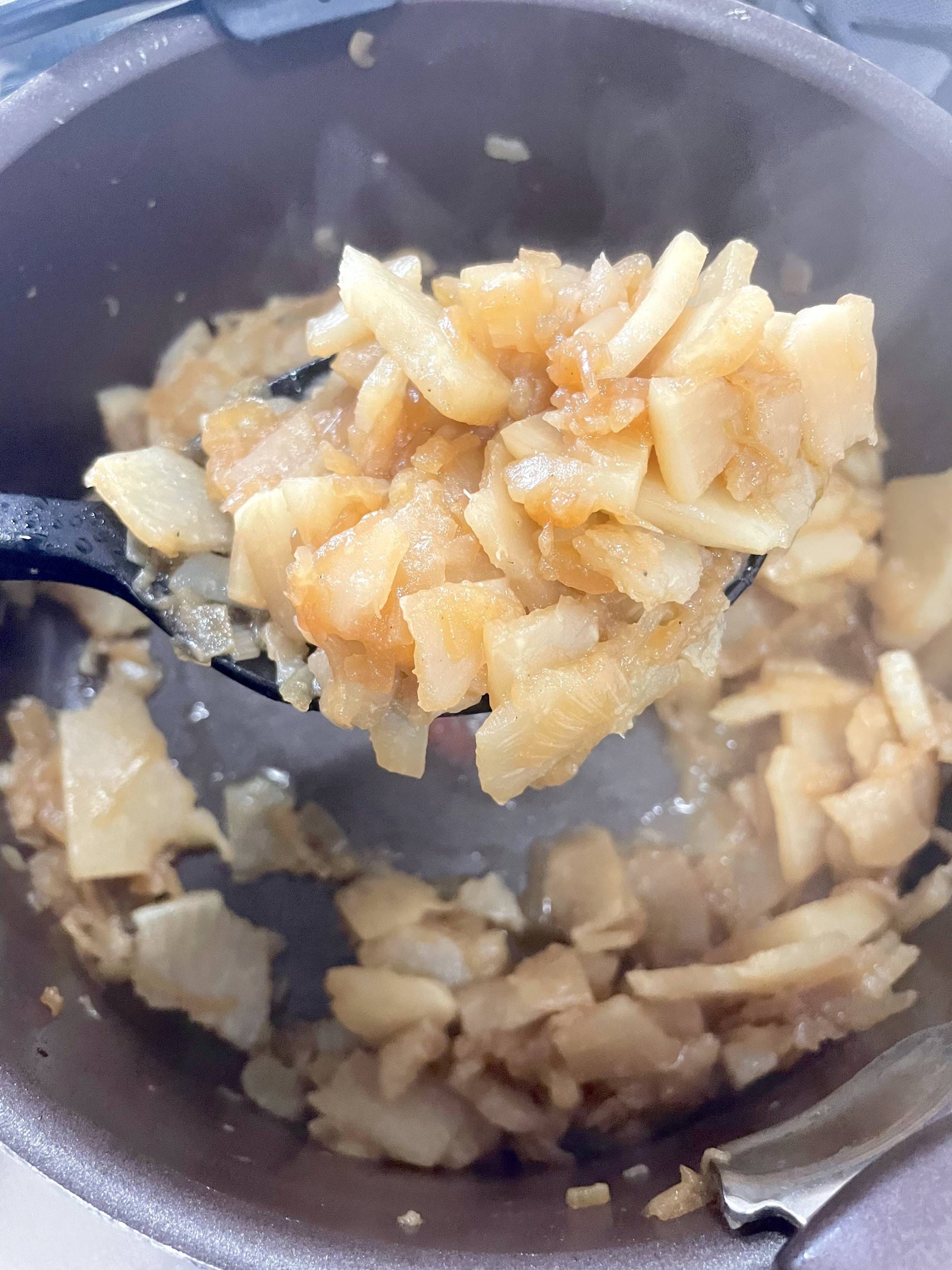 かぶは厚めに皮を剥いて薄切りにします。 ②の鍋に水100mlとかぶを加え、水分がほとんど飛んでとろとろになるまで煮込みます。