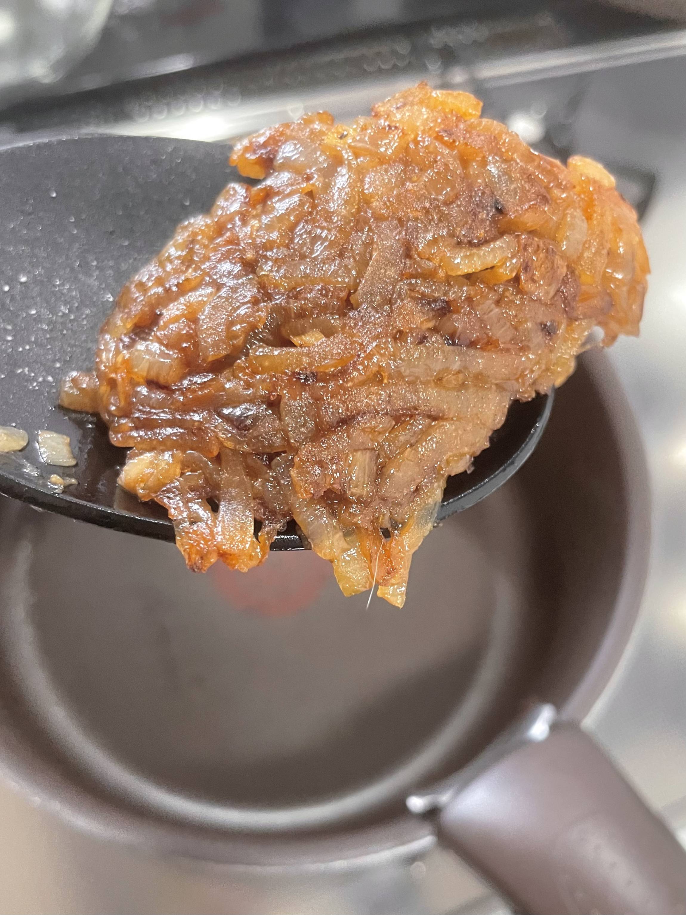 鍋にバターと①の玉ねぎを入れ、あめ色になるまで炒めます。 玉ねぎが写真のような色になるまで炒めてください!