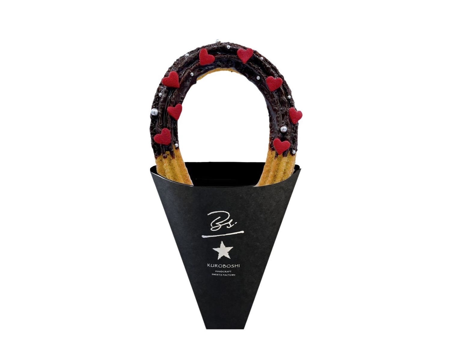 KUROBOSHIで一番人気キャラメルシュガーの上から、厳選したとろとろ濃厚チョコレートをたっぷりと。ハート型のトッピングシュガーやアラザンを散らし、バレンタインの季節にぴったりなチュロスに仕上がっている。