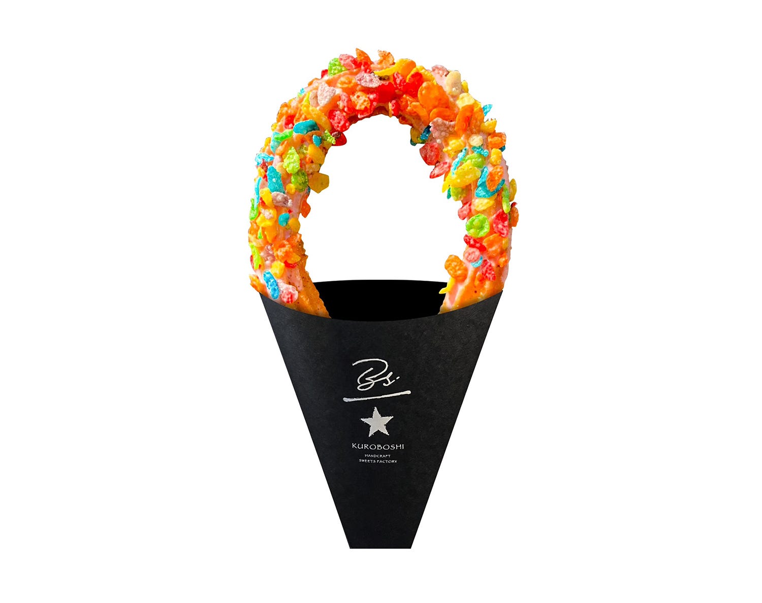 ストロべリ―チョコレートソースをかけたチュロスとやさしい甘さのぺブルス(シリアル)が合わさり、サクサクした食感が楽しめる。アメリカンでカラフルな可愛いビジュアルはぜひ写真に収めて!