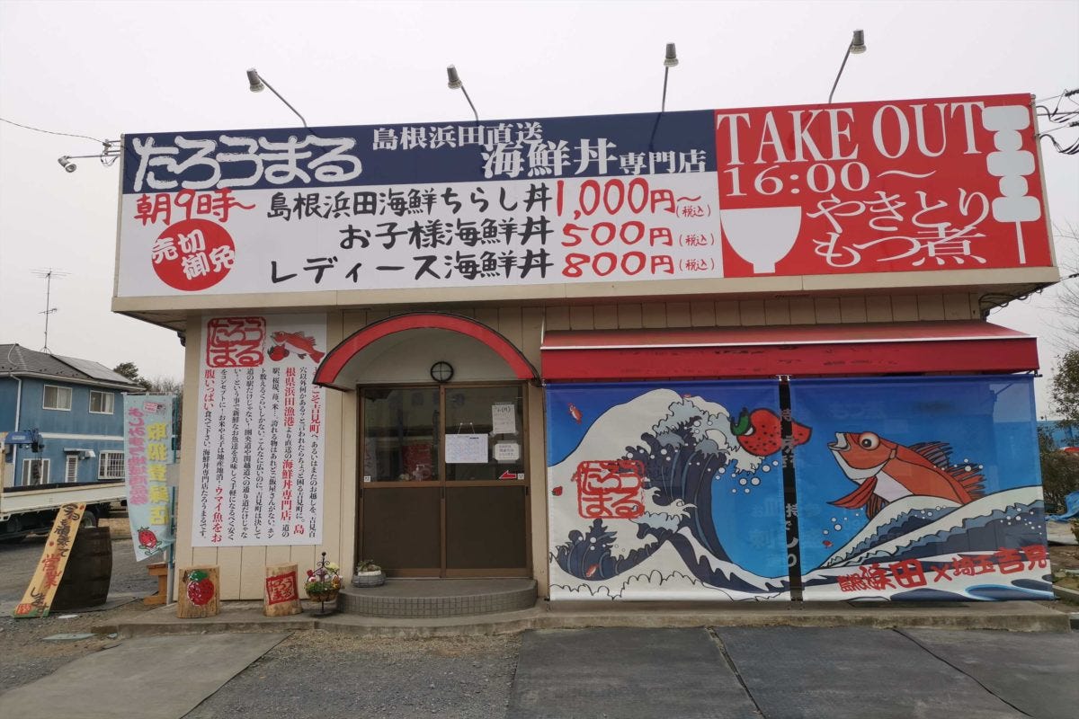そんな吉見町に、救世主とも言えるスゴい店が登場した。その店「たろうまる」は、島根県浜田漁港直送の海鮮丼を提供する専門店で、16時からは焼き鳥やもつ煮を販売しているという。